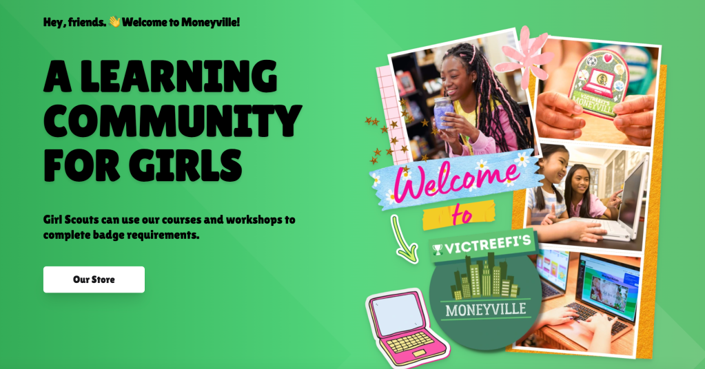 This website is associated with the Moneyville platform for girls. The Moneyville platform is THE destination for girls to learn important life skills! PLUS our workshops and courses help Girl Scouts earn badges. Troop leaders also rely on the content to help plan troop activities.
